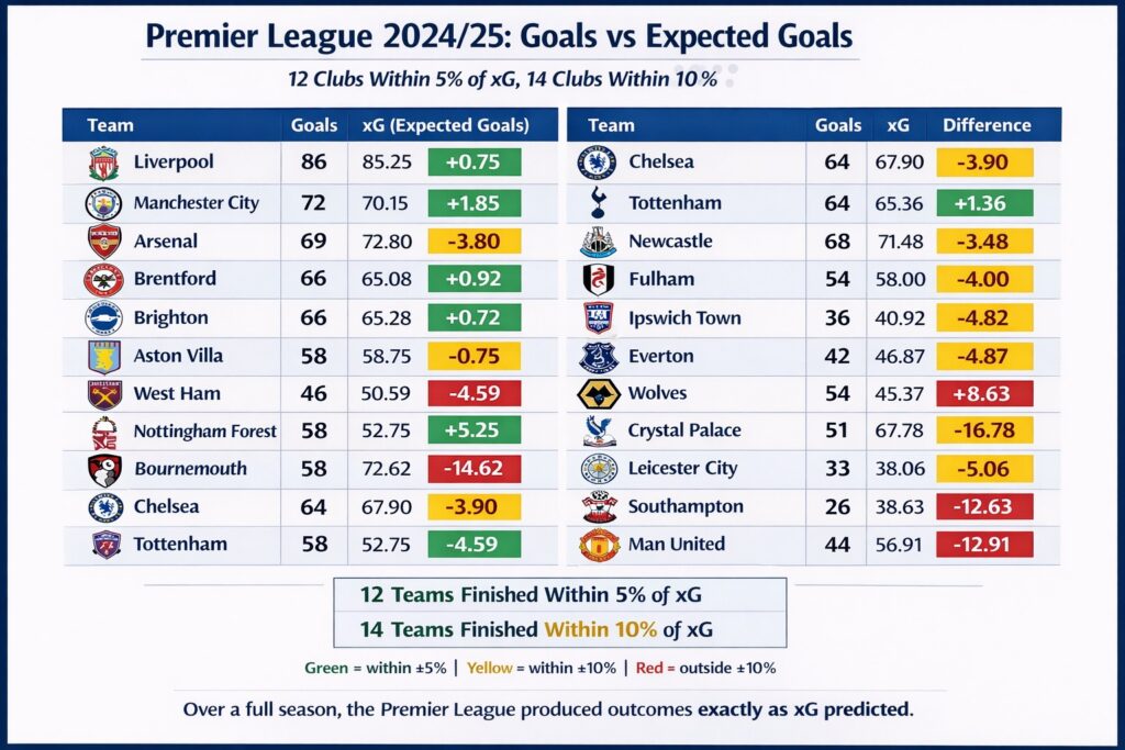 Premier League 2024/25 goals closely matched expected goals (xG), most teams stayed on target, proving xG is a reliable metric